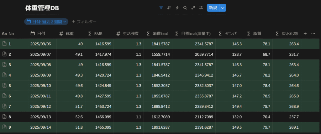 ・摂取カロリーを2800kcal以上程度取れると体重は増えそう。